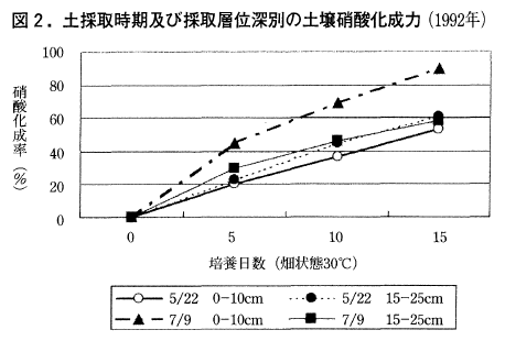 この高い肥料窒素の利用率はその後の調査で下層20cmという施肥部位が転換畑という特性もあり,硝酸化成能が低いために溶出した尿素が土壌ウレアーゼでアンモニアにはなるが硝酸化成を受けずにアンモニアのまま土壌に吸着され,効率的に吸収されたと考えられた(図2)。