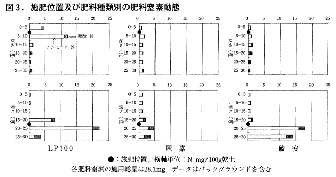 この検証のために,施肥位置を変えた無底ポット試験を実施したところ,20cmに局所施用したLPコートの窒素は全く溶脱することなく施肥位置に留まっていた(図3)。この効果は硝酸窒素による地下水汚染を防止する作用もあり,環境の世紀といわれる今世紀において新たな施肥体系となる可能性がある。