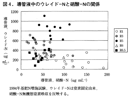 この10年来,従来型つまりリニア型溶出の被覆尿素に加えてシグモイド型溶出パターンを示す被覆尿素が開発されてきた。図4は1994年に基肥窒素を増施した試験において生育ステージ毎に導管の硝酸態窒素と根粒由来であるウレイド態窒素の関係を示したものである。