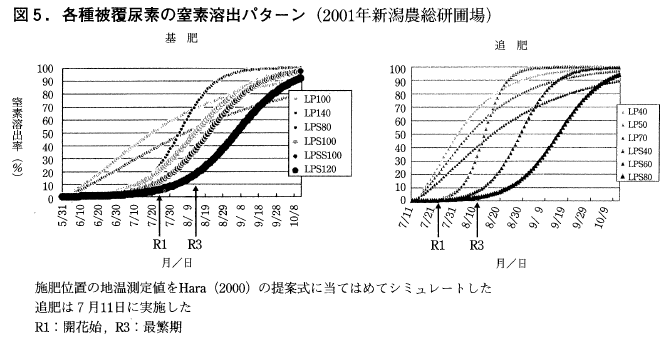 更に,近年は30%の転作率であり3年に1回の畑作は永遠の命をもっという水田土壌の地力窒素の疲弊を招いている。このために子実の小粒化や収量性の低下も懸念されている。根粒の硝酸感受性低下となる最繁期以降に溶出が開始されるシグモイド型被覆尿素を施用すると根粒着生部位でも窒素固定と両立する施肥効果が期待できる。この知見は愛知農総試の他,北陸の各県でも確認されている。どのタイプが効果が高いかを当研究所の圃場の平均地温で推定したところ基肥ではLPS120,7月上旬の培土期追肥ではLPS60がマッチすると判定され,Hara7)の提案するリチャーズ式の予測でもこの推定と合致した結果であった(図5)。