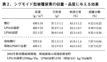 また,最近,新潟大学の大山研究室ではLPコート100の他に石灰窒素の下層施肥を実施し,石灰窒素においても高い増収効果を確認している6)。LPコート100と石灰窒素が必ずしも同等の肥効パターンとは思えないが,下層20cmという施肥位置が多少の肥効パターンの違いをマスクした結果と推定される。