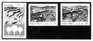 棚田と侵食防止の切手を紹介する。棚田の切手(キューバ)では水を貯める機能がよく分かる。南アフリカ・トランスカイの切手2枚は棚田ではないが,草地の侵食を小さなダムを作って防ぐ技術を紹介している。