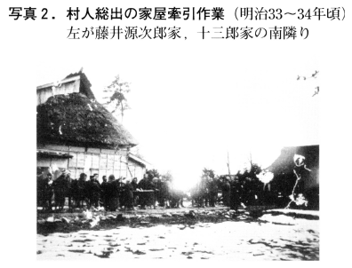 明治31年(1898)11月,集落の中央道の工事に着手した(写真3図2)。南北幅2間半(約4.5m)延長320間(約576m)の幹線道路をつくり道路の両側に3尺(0.9m)の用水路(消雪溝を兼ねる)を配した。さらに将来道路を拡幅することを考慮して用水と宅地の間に2間幅の集落共有地を確保した。その両側に家屋を建設した。道路と用水は翌年1月に完成した。次いで家屋移転が始まったが,移転資金は1口20銭の頼母子溝を設け,当選者から順次移転した。明治36年(1903)4月,家屋54戸中47戸,付属建物27棟の移転完成をみた。移転労力は地区民の奉仕により古い家は取壊して新しく建築した。自家の屋敷林の不足分は藤井が自家の屋敷林を供給した。