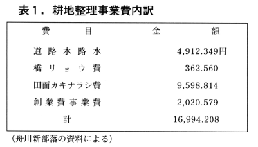 耕地整理事業費は表1のように約1万7千円もの高額になった。今日の整備事業と異なり,国の手厚い助成金はなく殆んど市中銀行からの借り入れに頼った。償還については増歩地のほとんどを魚津市の地主に売却して返済に充てられた。