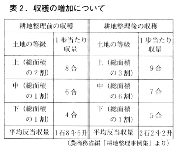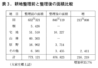 水田の画一化によって労力が削減され作業効率が高まった。畑・山林・原野・沼沢が開墾されて水田となり,集落に散在した山林や屋敷林による陰樹が解消された。そのため表3のように21町余の増歩や約20%の収穫増がみられた。
