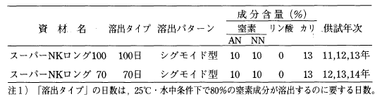 1)シグモイド型の溶出パターンを示す「スーパーNKロング100」および「スーパーNKロング70」は,安定した収量を示したうえに障害イモの発生も少なかった。このことから,同資材はナガイモの生育及び養分吸収特性に適合した緩効性肥料であり,ナガイモマルチ栽培における全量基肥用の資材として,その実用性はきわめて高いといえる。