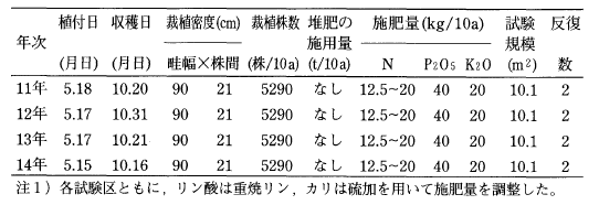全試験区ともに,トレンチャ施工後に通路を除いた幅およそ90cmの畦間に表面施用し,レーキで混和した。したがって,肥料はマルチ内の深さ10cmまでの範囲にしか混和されていない。