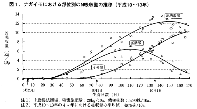 ②60日目~120日目頃の生育はきわめて旺盛であり,ナガイモの平均的な栽培日数である160日間のうち,この60日間(7月下旬~9月下旬頃)でほとんどの生育と養分吸収が行われる。
