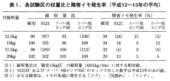 その成果の主な内容は,北海道の十勝地域においては,スーパーNKロング203(type70)の全量を基肥に施肥することによりナガイモの高品質安定生産が可能であり,その時の施肥量は窒素成分として15kg/10aが望ましいという結果であった。しかし,上記の試験成績はすべてマルチ資材を使用した条件下であったため,平成14年度は無マルチ栽培区も設定し,もう一年間試験を継続した。したがって,今回は平成14年度の無マルチ栽培下における試験結果も含め,ナガイモに対するスーパーNKロングの施用効果について考察する。