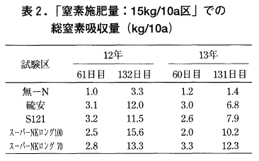 試験を行った平成12年は高温年であったのに対し,平成13年は7月以降の気温が常に平年を下回る低温年であった。したがって,平成13年は茎葉の生育がやや抑制気味であり,平成12年に比べると「硫安区」・「スーパーNKロング100区」での総窒素吸収量は約5kg/10aも低い値となった(表2)。