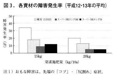 2)しかし,「スーパーNKロング100」では,初期生育がきわめて旺盛となった平成12年と13年にはナガイモに対する窒素の供給がやや遅れたことから,北海道におけるナガイモ栽培には溶出の早い「スーパーNKロング70」が適していると思われる。