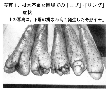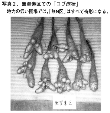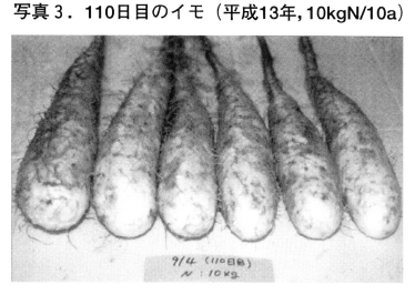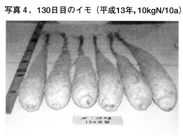 写真1に示したように,特にナガイモの生育が旺盛な高温年には,下層の排水性が劣る圃場ではイモの先端に障害が多く発生することが分かっている。しかし十勝農試圃場では,低温年あるいは排水の良好な場所であっても,窒素施肥量が10kg/10a以下の試験区では毎年多くの先端奇形が発生する。その症状は植付け後90日目頃(8月中旬)から徴候が認められ,110日目を過ぎると写真3のように容易に判別できるようになる。8月の1ヶ月間はナガイモの生育がもっとも旺盛な時期であるが,特にイモ長の増加が著しい「イモ伸長期」にあたり,一日で1cm近くイモが生育する場合もある。したがって,イモ先端部が盛んに細胞分裂を繰り返し,土壌深くイモが伸長していく時期に窒素不足がおきることが,写真3,4に示した先端奇形の原因であると考えられる。