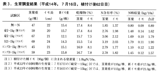 植付け後62日目の調査では,平成12年及び13年に比べて茎葉の生育量は60%程度であり,初期生育が不良であった。スーパーNKロング70はマルチ区でもやや生育及び窒素吸収量が劣ったが,無マルチ処理での肥効が明らかに遅れていた。