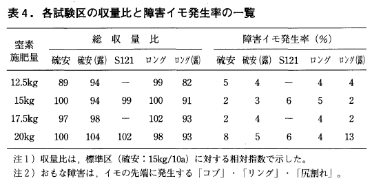 イモ先端部の障害は「無N-区」では100%であったが,それ以外では全般的に発生が少なく5%前後の値であった。先端部の奇形以外の障害発生もほとんどなく,規格内率がきわめて高い年であった(表4)。スーパーNKロング70の施用効果は,マルチ栽培では速効性肥料区と同等であったが,無マルチ栽培ではやや劣る結果となった。本年度は低温であったうえに,施肥窒素吸収期である9月までの降水量が平年をかなり下回る乾燥年であったことも無マルチ区でのスーパーNKロング70の肥効および生育が劣った要因と考えられる。