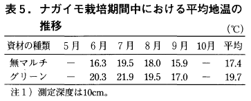 平成14年は,ナガイモ植付け期の6月中旬~下旬は気温は高めに推移したが,その後,萌芽期以降の6月中旬からは平年を下回ることが多く,やや低温年であったといえる。そのため,マルチによる生育促進効果が認められ,無マルチ区に比べてやや増収となった。