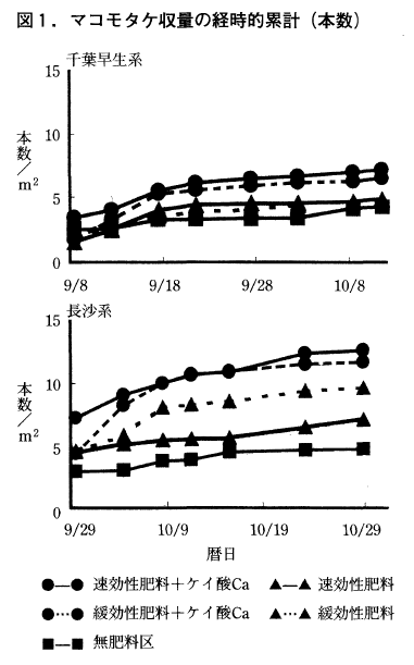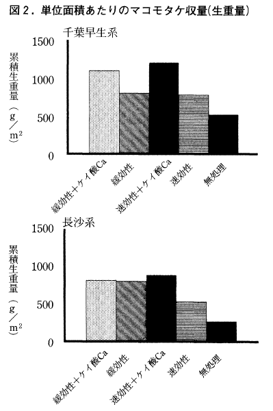 施肥量は土壌肥沃度,堆肥の施用量でも異なるが,標準的には基肥はN,P2O5,K2Oでそれぞれ10kg/10a,追肥はN,K2Oをそれぞれ2.5kg/10a程度7月中旬と8月中旬に施用する(長島1999,2000)。また肥効調節型肥料(100日タイプの被覆尿素)を用いれば図2に示されるように多少減収するが,全量基肥施用栽培が可能となり追肥が省略できる。さらに収穫期のマコモ葉には6%前後のケイ素(Si)が含まれており,多孔質ケイ酸カルシウム(150kg/10a)やケイ酸カリウムなどの珪酸資材の施用が有効である。図2を見ると緩効性肥料区も速効性肥料区もケイ酸カルシウムの施用効果が充分期待できる。マコモタケは耐肥性が強く,長野県豊野町では9月初旬に3回目の追肥を行い,N全量で10a当たり28kgを施用し,多収栽培を試みている。