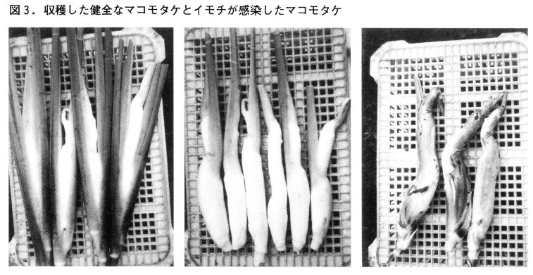 一方,水稲のイモチ病はマコモタケには感染しないといわれるがマコモタケ特有のイモチ病があり,図3に見られるような品質低下を招く。この他にもマコモの病気としてはサビ病,紋枯れ病などがある。現在のところ登録殺菌剤は無いので畦間と株間を充分に保ち,株内の枯死葉や無効分げつは除去し,通風を良くすることが重要である。また完全防除は難しいが,ケイ酸資材の施用で,茎葉の物理的抵抗を高めることによって,稲と同様に,ニカメイガやイモチなどの病虫害を軽減することができる。