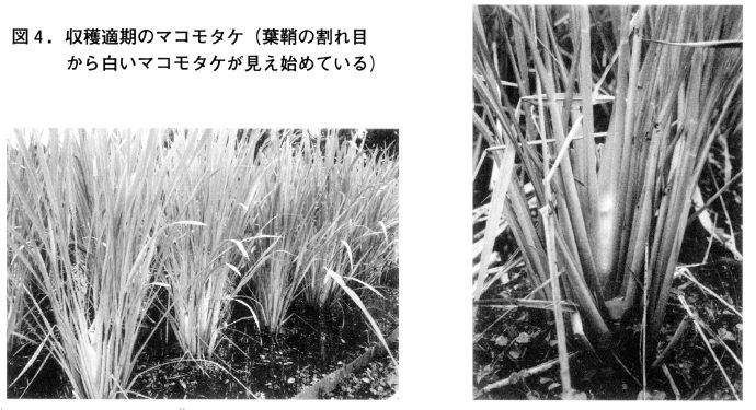 マコモに共生する黒穂菌は気温が20℃前後になると活動が活発化し,収穫は早生種では9月中旬頃から始まる。図4のように,茎が肥大し,葉鞘の抱合部がゆるみ中の白いマコモタケが見えた時を収穫適期とする。適期を過ぎると内部の黒穂菌による黒色斑点が多くなる。各品種の収穫適期は1ヶ月程度であるので早晩品種の組み合わせによって収穫時期の拡大と労働力の分散を図る。また植え付け時期や気温,窒素施用量を変えることによって収穫期を調節することが可能である。しかしながら,豊野町の寒冷紗試験を見ると,日射量は生育量に大きく影響するが生育速度に影響せず,収穫期の調節はできないことが明らかにされた。また道山らの研究によれば日本の栽培マコモは日長反応性を示すと言われる(道山ら,1993)。
