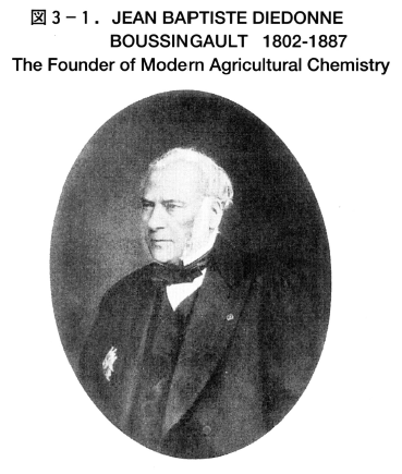 前に触れたRussellの著書’Soil Conditions and Plant Growth’の扉には,農芸化学の創始者としてブサンゴーの肖像画(図3-1)が掲げてあります。ブサンゴーは多くの事典に紹介されていますが、岩波の「西洋人名辞典」(1981)には次のように簡潔に記されています。