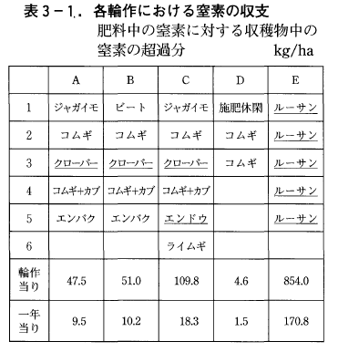 そして作物が吸収した養分は,どれくらいが肥料から,どれくらいが肥料以外の土や雨などから由来したか,またそれが作物の種類によってどれくらい異なるかを調べました。その結果,輪作の種類によって作物が吸収する養分の量,特に窒素の量は著しく異なり,輪作の中にマメ科植物があると窒素の吸収量は施肥量を大幅に超えていました。その一例を示すと表3-1のようです。