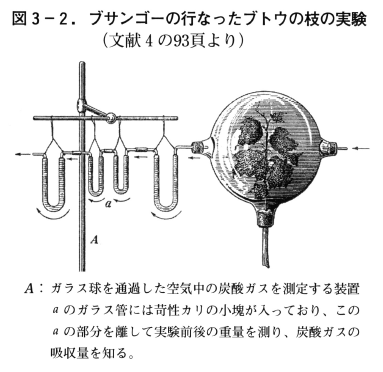 前に紹介したようにすでにド・ソシュールは植物が光のもとで炭酸ガスを固定することを証明していましたが,それは数パーセントという大気中よりはるかに高い濃度の炭酸ガス中で行なったものでした。ブサンゴーは通常の大気中の希薄な炭酸ガスを果たして植物が利用しているのかを確かめるために,ブドウの枝を用いて次のような実験を行いました。