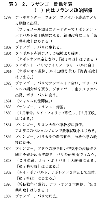 ブサンゴーが85年の生涯を送った19世紀のフランスはまさに激動の時代でした。表3-2に見られるように,彼が生まれたときのフランスは大革命後の「第一共和政」からナポレオンの「第一帝政」に移り,ナポレオンの失脚後はブルボン家のルイ18世,シャルル10世の「復古王政」,オルレアン家のルイ・フイリップの「七月王政」に戻り,更にナポレオンの甥のルイ・ボナパルトによる「第二共和政」と「第二帝政」を経て,彼の晩年には再び「第三共和政」になるという目まぐるしい変化をした時代でした。
