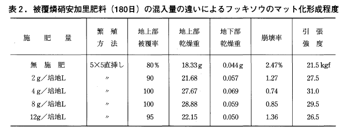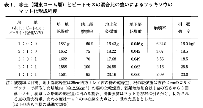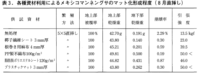 自根でマット化し難い植物は,表3に示したとおり,椰子繊維シート等補助的な資材を底面に敷くと強度が増しマット化が促進される。