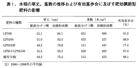 1996年から1998年にかけて北部九州の灰色低地土で,代かき同時土中点播栽培した水稲品種「ヒノヒカリ」の最高分げつ期までの生育はリニア型溶出のLP100区で旺盛であったが,それ以降の生育が不良で,有効茎歩合は61%と低かった(表1)4)。これに対し,シグモイド型単独(LPS100,LPSS100)区では初期生育はリニア型よりも劣ったが,有効茎歩合は69~77%と高かった。また,LP50とLPSS100とを1:2に配合するとLPSS100単独施用よりも初期生育は旺盛となった(表1)。
