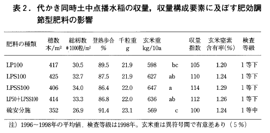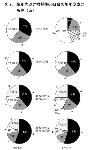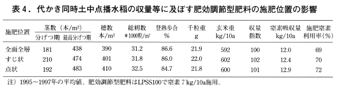 以上のことから,代かき同時土中点播水稲栽培のように落水管理を前提とした湛水直播では,基肥として速効性窒素を用いるのは好ましくなく,肥効調節型肥料を用いることが有効であると考えられた。