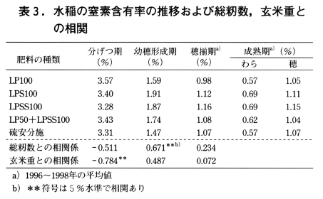 以上のことから,リニア型単独(LP100)よりもシグモイド型単独(LPS100,LPSS100)およびリニア型とシグモイド型との配合(LP50とLPSS100)の方が収量でまさり,その要因は溶出パターン(図1)が示すように生育中~後期の窒素供給力であると考えられた。