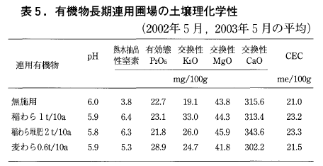 2002年および2003年の水稲作付前土壌の理化学性の平均値は表5のようになっており,有機物無施用土壌では交換性K2Oおよび可給態窒素の1つである熱水抽出性窒素10)が4mg/100g乾土以下と低く,窒素地力は最も低かった。これに対して,稲わら堆肥連用土壌,稲わら連用土壌は熱水抽出性窒素が6mg/100g乾土以上となり,窒素地力は最も高く,交換J性CaO,交換性K2Oも高かった。また,麦わら連用土壌は有効態P2O5が高く,熱水抽出性窒素は有機物無施用区と稲わら連用区,稲わら堆肥連用区の中間の5mg/100g乾土程度であり,窒素地力は中程度であった。