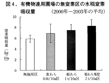 一方,無窒素区の水稲窒素吸収量で地力窒素を判定する方法もあり11),これは年次変動が大きいため2000年~2003年の平均でみると,有機物無施用区は6kg/10a,麦わら連用区7kg/10a,稲わら連用区7.5kg/10a,稲わら堆肥連用区8kg/10a程度であった(図4)。これを福岡県における地力の判定基準11)と照らし合わせると有機物無施用区は地力低,麦わら連用区は地力中,稲わら連用区は地力中~高,稲わら堆肥連用区は地力高に相当していた。