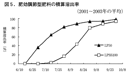 すなわち,7月下旬の水稲の最高分げつ期までにLP50が80%以上溶出して,基肥および中間追肥の役割を果たし,最高分げつ期以降,LPSS100の溶出が始まり,8月末の出穂期を中心として穂孕期から9月上旬の穂揃期までには80%以上溶出し,穂肥の役割を果たしていた。