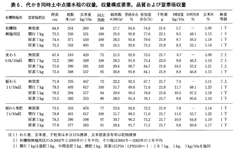 これに対し,地力が中程度(熱水抽出性窒素5mg/100g程度)の麦わら0.6t/10a連用区および地力中~高の稲わら1t/10a連用区(熱水抽出性窒素6mg/100g以上)では,慣行施肥量7kg/10aの30%減の窒素5kg/10aでも地力窒素の吸収量が有機物無施用区に比べ多いため,5~6%程度の減収にとどまり,玄米窒素含有率も1.3%を超えることが無く問題ないと考えられた(表6)。
