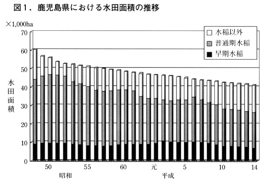 鹿児島県の農耕地面積は127,700haで,そのうち水田面積は32%を占める。図1に示すとおり,昭和48年に60,000haあった水田面積は,昭和58年には50,000haを割り,その後も減少が続き,平成14年には41,100haまで減少した。本県の水稲栽培型には,温暖な気象条件を活かした早期水稲,そして普通期水稲があり,減少が著しいのは普通期水稲である。早期水稲は温暖な海岸沿いの平坦地に広がり1筆当たりのほ場面積も広いのに対して,普通期水稲はいわゆる中山間地域に分布し,立地および水利条件が不利であるうえ,高齢化等による労働力不足によって耕作放棄田が増加している。