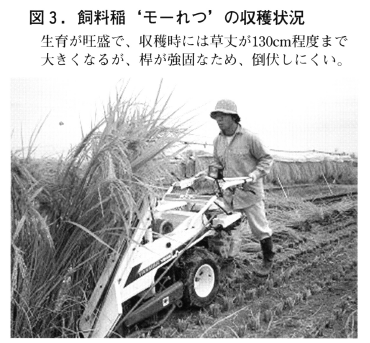 飼料稲はここ数年,栽培面積が増加傾向にある作物で,平成15年には23市町村で486戸の農家によって145haが作付けされた。供試品種は’モーれつ’で,水稲と同一施肥条件で栽培した。’モーれつ’は系統名KB3506のインド型品種で,繊維質が柔らかいため牛の噌好性が良い(図3)。