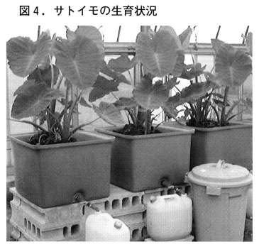 供試品種は’大野芋’で,栽培型は4月下旬定植,10月下旬収穫の普通掘りとした。施肥窒素量は慣行施肥量の15gm-2を全量基肥で施用し,かんがい量は1回当たり60Lm-2を栽培期間中に11回,畦間かんがいした。また,かんがい後は湛水状態で放置し,翌日,枠の底部に取付けた蛇口を開放して浸透水を回収した(図4)。