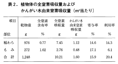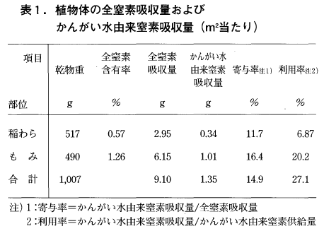 表1に植物体の全窒素吸収量およびかんがい水由来窒素吸収量を示す。全窒素吸収量は稲わらで2.95gm-2,もみで6.15gm-2,合計9.10gm-2であった。このうち,かんがい水由来窒素吸収量が占める比率は稲わらで11.7%,もみで16.4%,合計で14.9%であった。また,かんがい水から供給された総窒素量5.0gm-2のうち,植物体に吸収された比率は27.0%で,そのうち75%程度がもみに蓄積された。