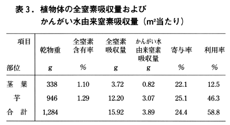 表3に植物体の全窒素吸収量およびかんがい水由来窒素吸収量を示す。全窒素吸収量は茎葉で3.72gm-2,芋で12.20gm-2,合計15.92gm-2であった。このうち,かんがい水由来窒素吸収量が占める比率は茎葉で22.1%,芋で25.1%,合計で25.4%であった。また,かんがい水から供給された総窒素量6.6gm-2が,植物体に吸収された比率は58.8%で,うち,79%程度が芋に蓄積された。