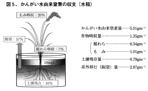 水稲および飼料稲栽培では,かんがい水由来窒素供給量から,作物吸収量,土壌残存量を差し引いた系外移行量が60%程度認められた。これは,添加した窒素の形態が硝酸態であることから,ほぼ脱窒量であると推測できる。