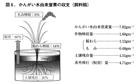 飼料稲栽培では,かんがい水由来窒素供給量7.82gm-2のうち20%が作物に吸収され,60%が脱窒し,計80%,4.71gm-2の窒素が浄化された。