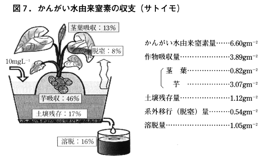 また,植物体による窒素収奪の観点からみると,約8割が芋に蓄積されるため,収穫時に茎葉を圃場還元した場合でも,作物に吸収されたかんがい水由来窒素のほとんどが圃場外に持ち出される。