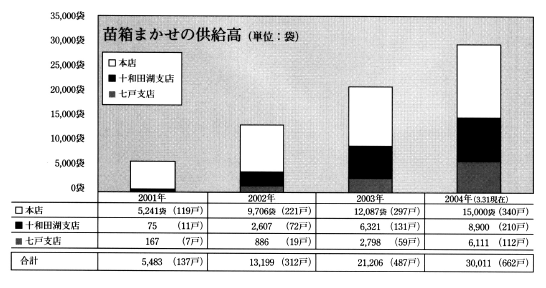 旧JA上北町の米作地帯では,このような特長に注目して水稲の育苗箱全量施肥栽培についての試験を重ね,平成6年頃から普及拡大に努めてきた。稲作中心の兼業農家が8割以上を占める管内では,年々普及が広まり,平成16年度は平成13年度に比べ約6倍の662人,全組合員のおよそ4割で導入した。