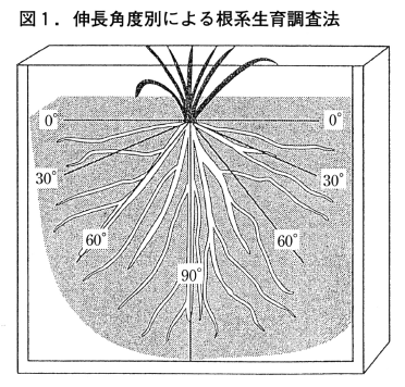 根系調査は根の伸長角度別に3分割し,0~30°,30~60°,60~90°の伸長角度内に含まれる根系を調査した(第1図)。土壌中の根の伸長角度の測定にあたっては,調査株の中心を基準として根と土壌下6cmの水平線との交点と土壌面(水平)との角度を伸長角度とした(Pinthus 1967,鯨・松崎 1998)。