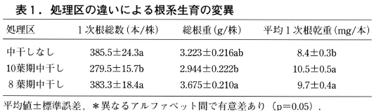 根箱を用いたモデル実験の結果,中干しの有無および中干しの実施時期の遠いによって,コシヒカリの根系生育は影響を受けた。10葉期中干し区では根系生育が劣り,8葉期の中干し実施によって根数は有意に増加することはないものの,時期の遅い中干しの実施は根数の増加にマイナスの影響を及ぼすことが示唆された。