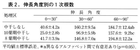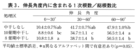 土壌中における伸長角度別の1次根数および伸長角度別1次根数/総根数比を第2表と第3表に示した。8葉期中干し区と比較して10葉期中干し区では各伸長角度別1次根数が有意に少なく,伸長角度別1次根数/総根数比は60~90°の伸長角度を除いて有意に小さかった。