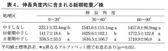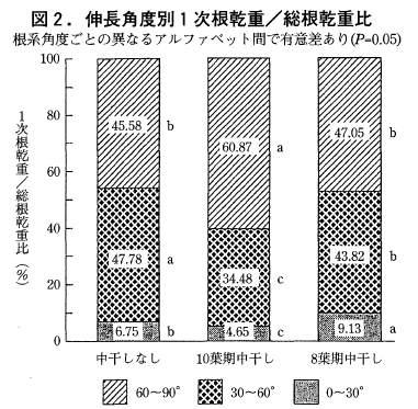 根の伸長角度別の株あたり総根乾重を第4表に示した。0~30°および30~60°の伸長角度内に含まれる総根乾重は8葉期中干し区で大きく,試験区の違いによる有意差が認められた。60~90°の伸長角度内に含まれる根乾重には,試験区の違いによる有意差が認められなかった。60~90°の伸長角度内に含まれる1次根重/総根重比には試験区間で有意差が認められ,10葉期中干し区が最大であった(第2図)。
