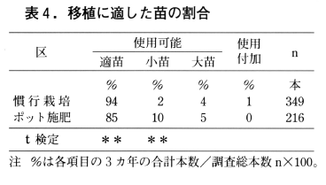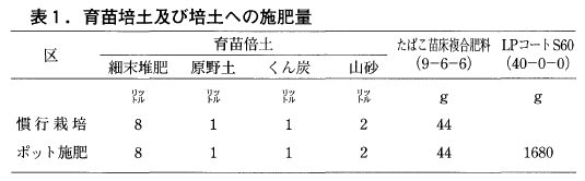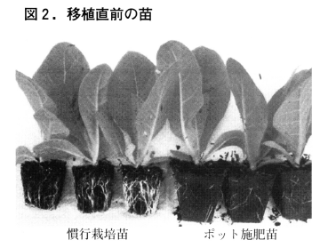 以上のことから,ポット施肥区の苗は移植や栽培上からは問題はないが,潅水量不足によって小柄になる可能性があることから,潅水量と回数についてさらに検討する必要がある。