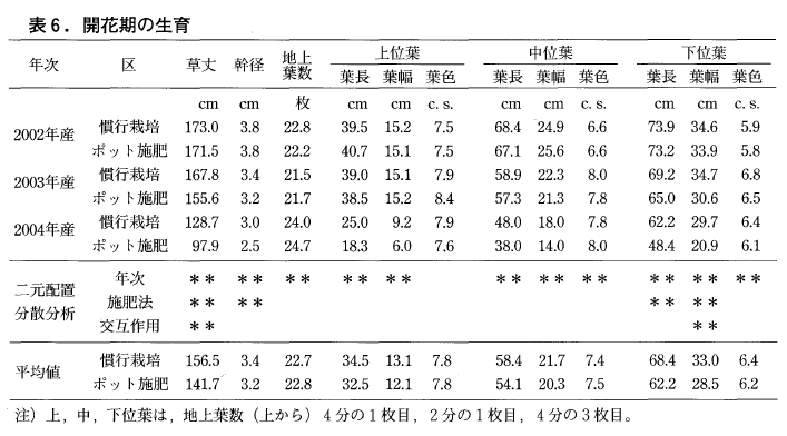 年次間は,すべての項目で有意差がみられた。施肥法間はしぼり丈,葉長及び葉幅で有意差がみられ,ポット施肥区は慣行栽培区に比べ,しぼり丈が短く,最大葉が小さかった。交互作用は施肥法間と同様にしぼり丈,葉長及び葉幅で有意差がみられた(表3)。これは,2004年のポット施肥区の生育が慣行を上回ったことによる。
