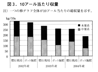 年次間及び施肥法間とも中葉系で有意差がみられたが,本葉系では有意差はみられなかった。ポット施肥区は慣行栽培区に比べ,中葉系の収量が少なかった(図3)。開花期における下位葉の展開が劣ったこと(表6)が原因と考えられる。